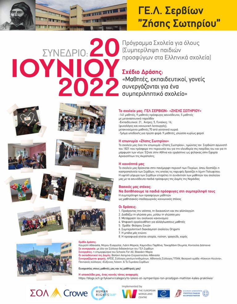 ΓΕΛ Σερβίων Επικοινωνία: 2464021586, 28ης Οκτωβρίου 24Β, Σέρβια, 50500, email: mail@lyk-servion.koz.sch.gr Ιστοσελίδα Aφίσα παρουσίασης σχεδίου δράσης – ΓΕΛ Σερβίων Read more "Δεν ξεχνάω" Το τραγούδι των μαθητών του ΓΕΛ Σερβίων που δημιουργήθηκε στα πλαίσια του σχεδίου δράσης του σχολείου. Περισσότερα…Read more Καλές πρακτικές από το ΓΕΛ Σερβίων Δημιουργία ενός τραγουδιού αφιερωμένο σε όλα τα προσφυγόπουλα του σχολείου… και όλου του κόσμου… και διοργάνωση διαδικτυακής επιμόρφωσης- webinar Προφορικής Ιστορίας για την καταγραφή και την αξιοποίηση των προσφυγικών ιστοριών σύγχρονων προσφύγων και Ελλήνων απογόνων προσφύγων μετά τη Μικρασιατική Καταστροφή. Περισσότερα… Δημοσίευση 14 Μαρτίου 2022Read more