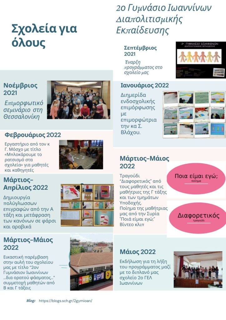 Το 2o Διαπολιτισμικό Γυμνάσιο Ιωαννίνων παρουσίασε σε μορφή αφίσας το σχέδιο δράσης που υλοποίησε το σχολικό έτος 2021-2022 στα πλαίσια του “Σχολεία Για Όλους – Συμπερίληψη Παιδιών Προσφύγων στα Ελληνικά Σχολεία”, με αφορμή το ετήσιο συνέδριο του έργου, στις 20 Ιουνίου 2022.